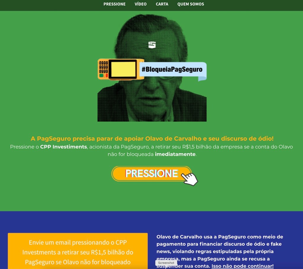 Não duvido de que realmente acreditem nisso, mas se seu objetivo fosse apenas informar empresas de que seus anúncios estariam sendo veiculados em websites indesejáveis, bastaria enviar-lhes e-mails. O fato de que atuam em público, incitando seus seguidores a boicotar as empresas anunciantes, refuta a justificativa dos militantes. E a insistência com que perseguem os que não se curvam a suas ameaças, publicando cobranças repetidas em suas redes sociais, termina de enterrar a desculpa fajuta. O Sleeping Giants Brasil julga, acusa e persegue seus adversários e o exemplo mais grotesco disso foi a criação de um website destinado exclusivamente a desmonetizar o filósofo Olavo de Carvalho.