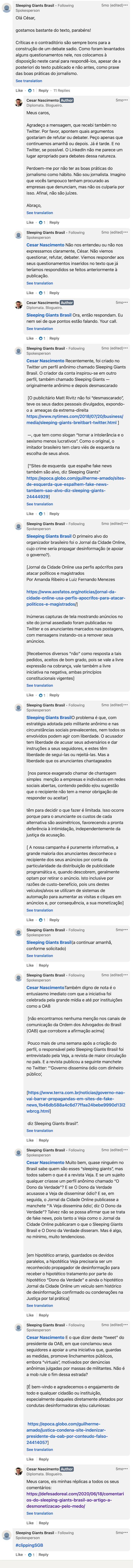 Olhando em retrospecto, acho que fui o primeiro e talvez o único a ter uma entrevista com o Sleeping Giants Brasil, até a publicação de entrevista com a Mônica Bergamo na Folha de S. Paulo. Também é digno de nota que, poucas horas depois do primeiro contato, ainda no dia 17, eu tenha sido novamente procurado por representantes do grupo, desta vez no Twitter, pelo perfil do Sleeping Giants Paraná.